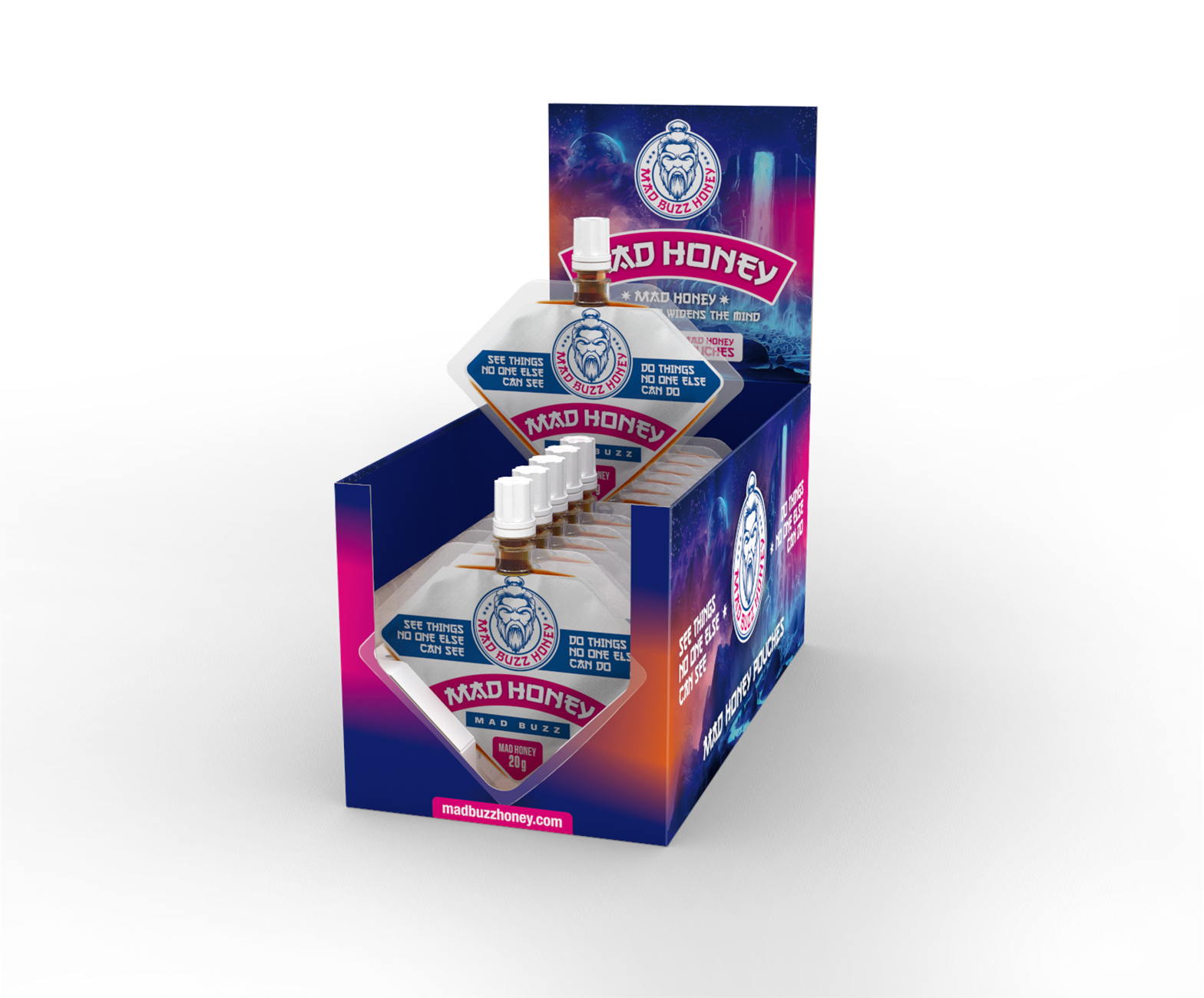 Mad Buzz Honey presents the Mad Honey Pouch 12-Pack. Each pouch is packed with 20 grams of genuine, potent mad honey, sourced from trusted local Nepali honey hunters. We ensure consistent purity and potency, offering you the finest mad honey in existence. This honey not only focuses and widens the mind but also sharpens your thoughts. It helps melt anxiety into the background, replacing it with calm confidence. Get ready to face your day or any extra-dimensional forces with Mad Buzz Honey.